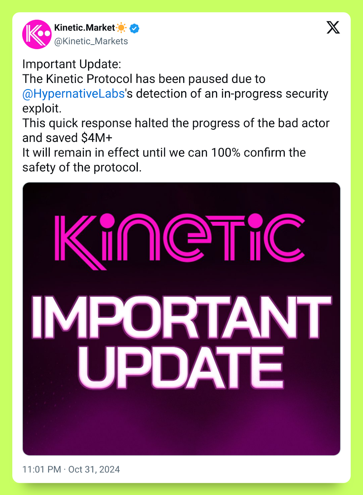 On Oct. 31, Hypernative detected a flash loan and permission vulnerability exploit targeting Kinetic Market, the premier lending protocol on the Flare Network. The platform identified the attack using out-of-the-box detection settings available to all customers. Kinetic paused the market shortly after the alert fired, limiting losses to a fraction of what was at risk and ensuring all affected users were made whole.