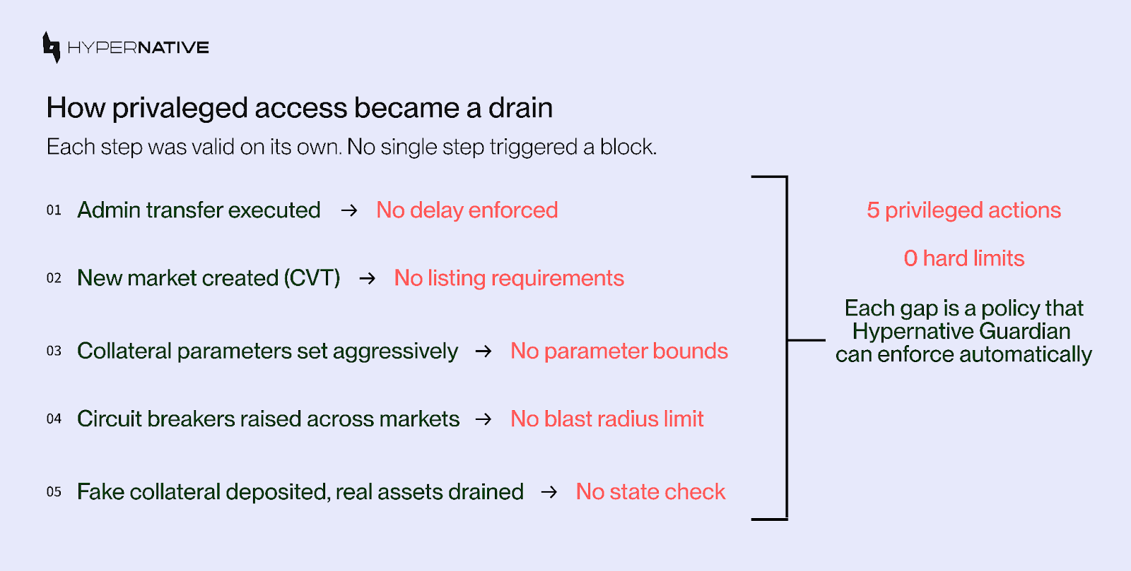 The attack combined social engineering, durable nonce transactions, privileged access, malicious market configuration, and rapid extraction of real assets against fabricated collateral. The attack did not include a contract bug.