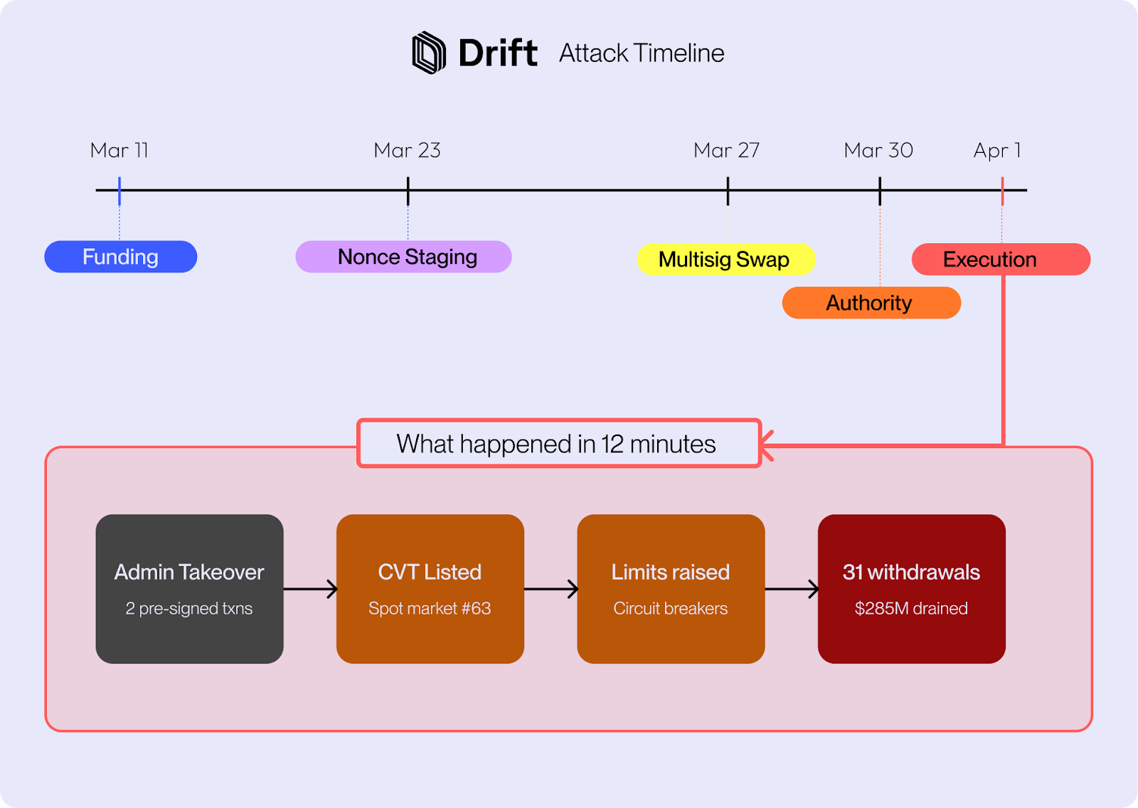 On April 1, Drift Protocol - the largest perpetual futures exchange on Solana - was drained of roughly $285M in less than 12 minutes. It is governed by a Security Council multisig, a standard DeFi pattern in which multiple signers must approve sensitive actions.